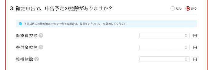 また「3. 確定申告で、申告予定の控除がありますか?」の項目で「あり」を選ぶと、医療費控除やふるさと納税以外の寄付金控除などが入力できる欄が表示されます。