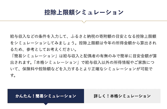 楽天ふるさと納税のシミュレーターも、「かんたんシミュレーター」と「詳細版シミュレーター」の2種類があります。