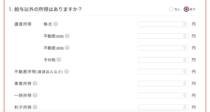 「詳細版シミュレーター」では、「1. 給与以外の所得はありますか?」の項目で「あり」を選ぶと、譲渡所得や不動産所得、事業所得などが入力できる欄が表示されます。