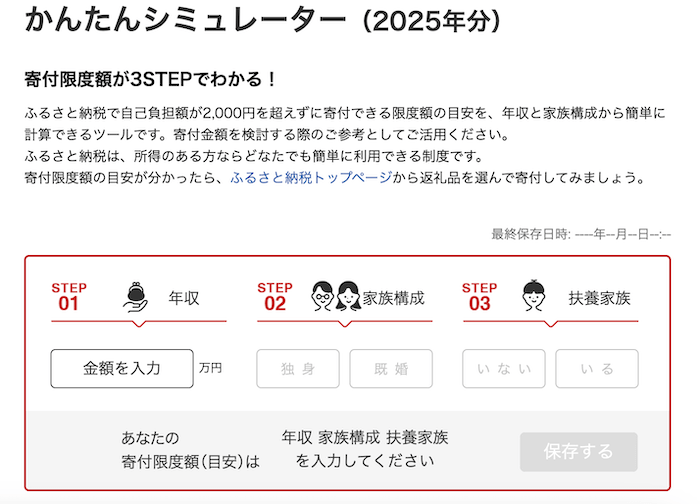 「かんたんシミュレーター」では、年収・家族構成・扶養家族の有無の3ステップで控除上限額の目安が計算できます。