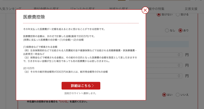 一方「詳しく!本格シミュレーション」では、「給与以外の所得」の項目で「あり」を選ぶと、年金収入や雑所得、事業所得などの項目も入力可能。生命保険料控除や医療費控除、住宅ローン控除なども入力できます。