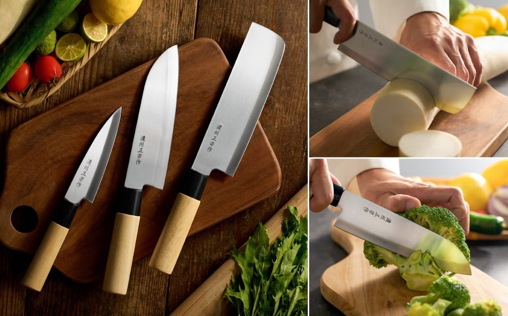 濃州正宗作 白木柄 ステンレス和包丁セット 【三徳包丁、菜切包丁、ペティナイフ】~和包丁 ステンレス素材なので錆びづらい 関の職人 白木ハンドル ほうちょう 包丁 日本製 国産 ステンレス おすすめ 人気 初心者の方にも~