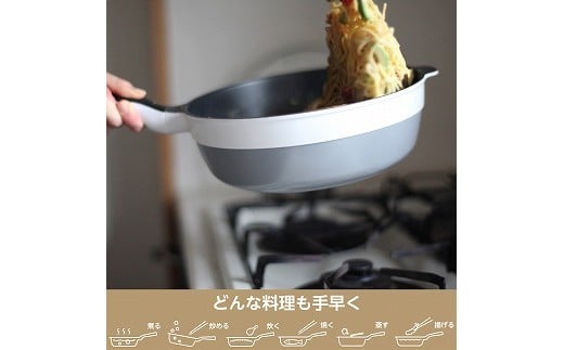 料理愛好家の平野レミさんが監修した次世代フライパンです。炒める、焼く、煮る、揚げる、炊くの全てを1台でこなすオールインワン機能が魅力です。軽量で熱伝導率の高いアルミ構造により、スピーディーな調理が可能。内面は滑らかで耐久性のあるコーティングを採用し、少量の油でも食材がこびりつきにくく、ヘルシーな調理が楽しめます。蓋は自立し、キッチンで場所を取らず、IHにも対応。平野レミさん考案のレシピも付いています。
