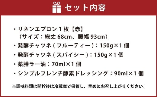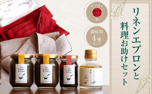 - 019-687-R リネンエプロン(赤)と料理お助けセット コラボ企画 調味料 ラー油 ドレッシング エプロン 日用品