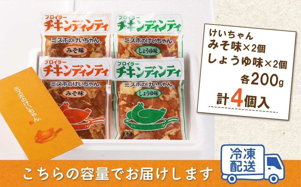 - ミズホのケイちゃんお試しセット チキンディンティ(みそ×2 しょうゆ×2) 計4個 冷凍配送 けいちゃん 鶏ちゃん 鶏肉 味付け 味付き 焼くだけ 簡単調理