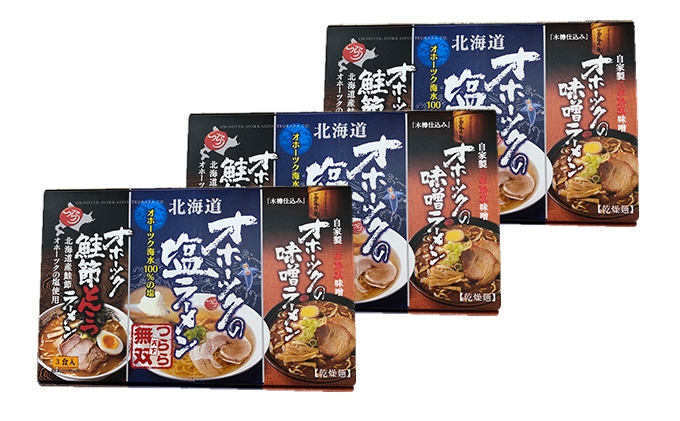 [№5930-0232]オホーツクのラーメンセット(塩・味噌・鮭節とんこつ各1)×3