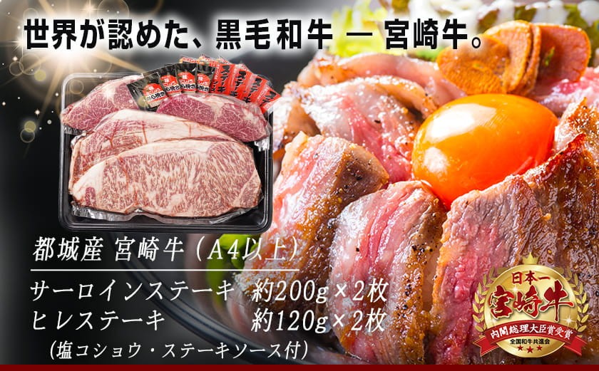 宮崎牛ヒレ・サーロインステーキ640g_AD-2504_(都城市) 牛肉 ブランド牛 ヒレステーキ 120g×2枚 サーロインステーキ 200g×2枚 ソース 塩コショウ 真空パック 希少部位