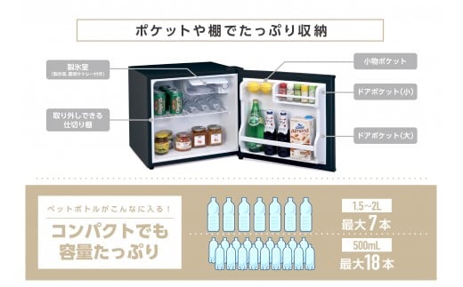コンパクトで1人暮らしやプライベートルームに最適な、45L 1ドア冷蔵庫です。ボトルポケットには1Lの紙パックや2Lのペットボトルも入ります。キッチンに置くメインの冷蔵庫とは別に、寝室や子供部屋などに置くのもいいですね。