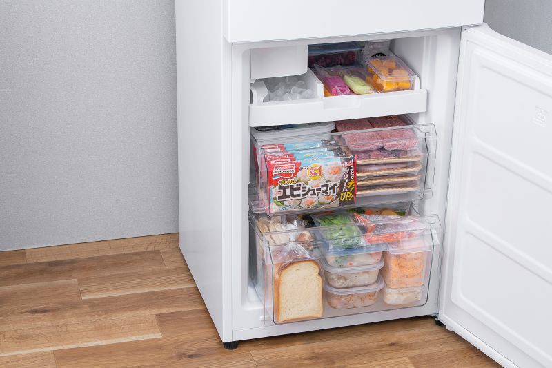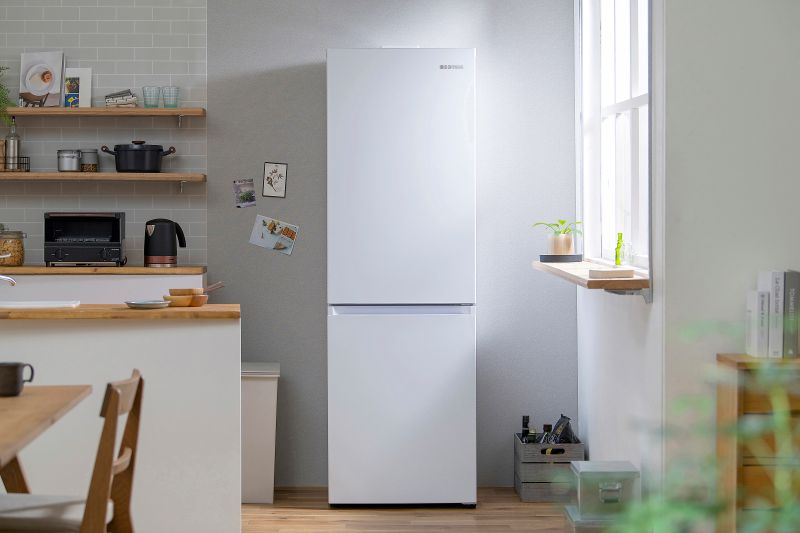 アイリスオーヤマのカメラ付き冷蔵庫です。301リットルの大容量で、冷蔵室と冷凍室が分かれた2ドアタイプ。冷蔵室は奥行き約46cmで、奥まで見やすく取り出しやすい設計。冷凍室は91リットルの大容量で、3種類の収納が可能。庫内カメラ「ストックアイ」が搭載され、開閉時に中身を撮影し、アプリで確認できるので、買い物時に便利。右開きで、幅約59.5cm、奥行約60cm、高さ約189cmのサイズ。アイスシャベルと浄水フィルターも付属しています。