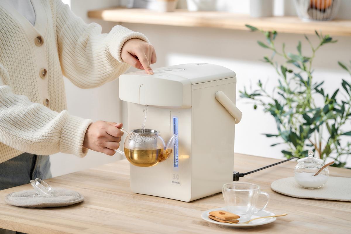 アイリスオーヤマの電気ポットは、スタイリッシュでコンパクトなデザインが特徴です。家庭やオフィスにぴったりで、3.0Lの大容量。保温設定は70℃、80℃、90℃、98℃の4段階から選べ、用途に応じた温度管理が可能です。水位窓ランプで湯沸かしや保温の状態を一目で確認でき、再沸とうモードでカルキ抜きも簡単に行えます。省エネ設計で、日常の使い勝手を考慮した便利な一品です。