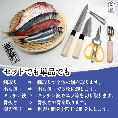 【さかなクンオリジナル】(柳刃包丁、出刃包丁、キッチンバサミ、鱗取り、骨抜き)5点セット
