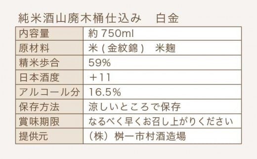 - 純米酒山廃木桶仕込み 白金 750ml[桝一市村酒造場] お酒 日本酒 地酒 ご当地 生酒 プレゼント 贈答 長野県 信州 お取り寄せ 蔵元直送[C-401]