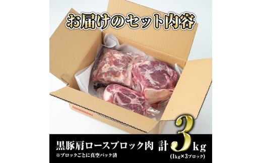 - C0-07 鹿児島県産豚肉!黒豚ブロック肉(肩ロース)約1kg×3ブロック(計3kg) ふるさと納税 伊佐市 特産品 国産 鹿児島 九州産 豚 豚肉 肩 ロース チャーシュー 焼豚 BBQ バーベキュー キャンプ アウトドア 冷凍 冷凍便【財宝】