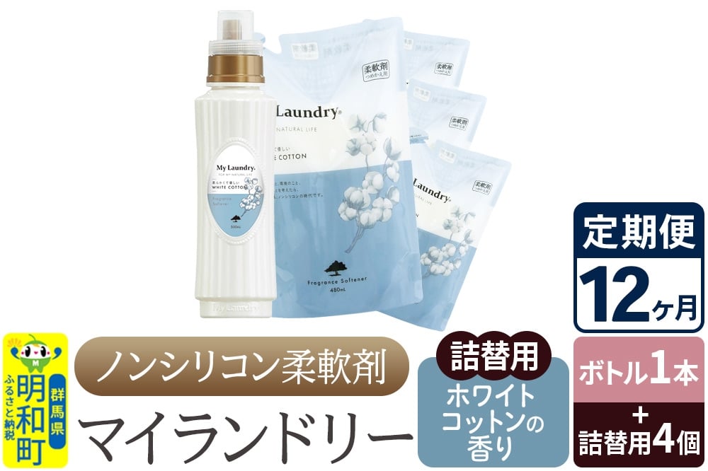 - 《定期便12ヶ月》ノンシリコン 柔軟剤 マイランドリー (ボトル1本+詰替用4個セット)【ホワイトコットンの香り】