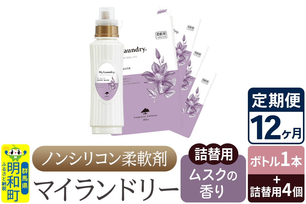 - 《定期便12ヶ月》ノンシリコン 柔軟剤 マイランドリー (ボトル1本+詰替用4個セット)【ムスクの香り】
