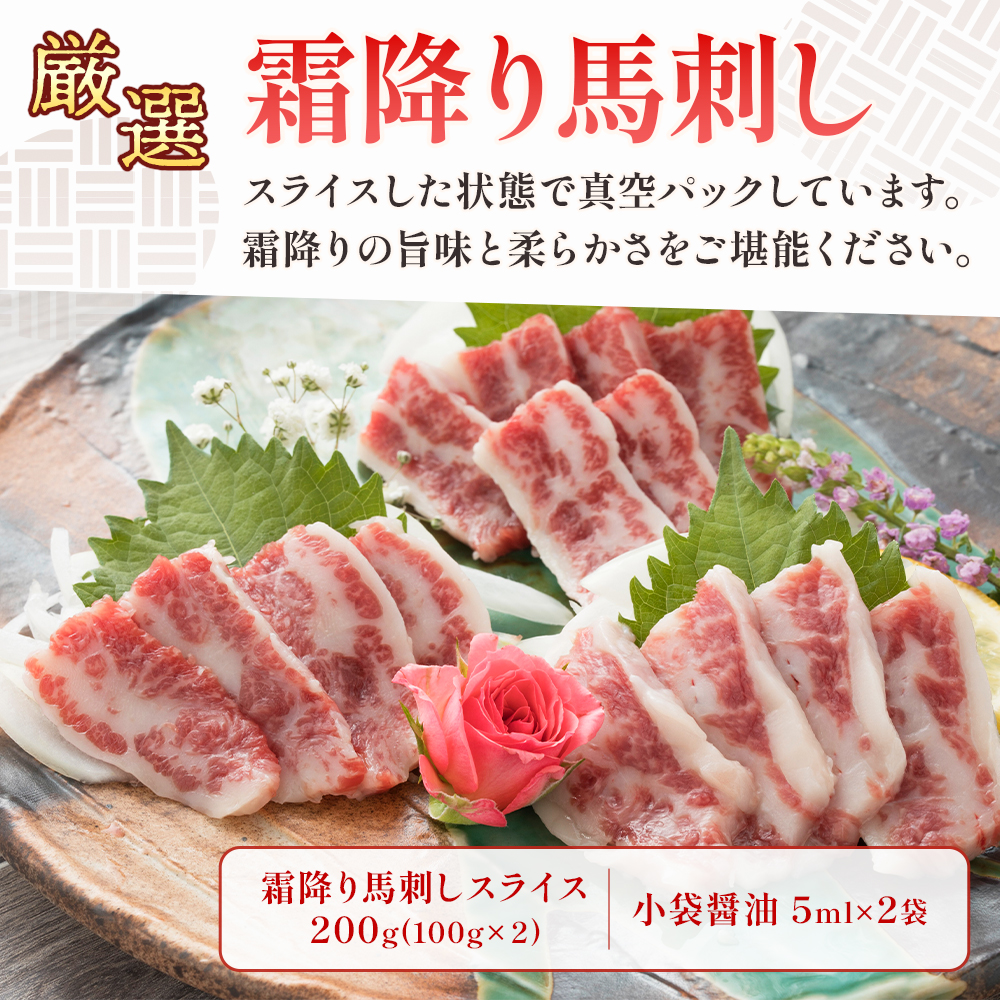 霜降り馬刺しスライス 200g 小袋醤油付 霜降り スライスでお届け【本場 熊本 馬刺し】馬肉 小分け 冷凍 国産 熊本県 030-0710