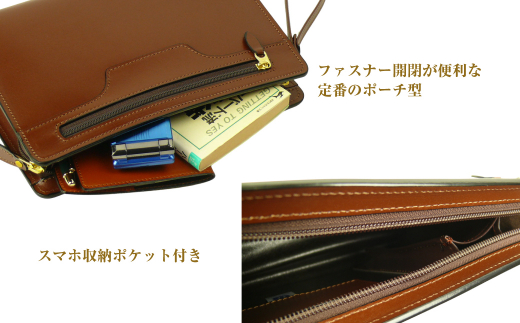 スマホ収納ポケット付きの本革メンズポーチ【テレポーチ】(ダークブラウン)