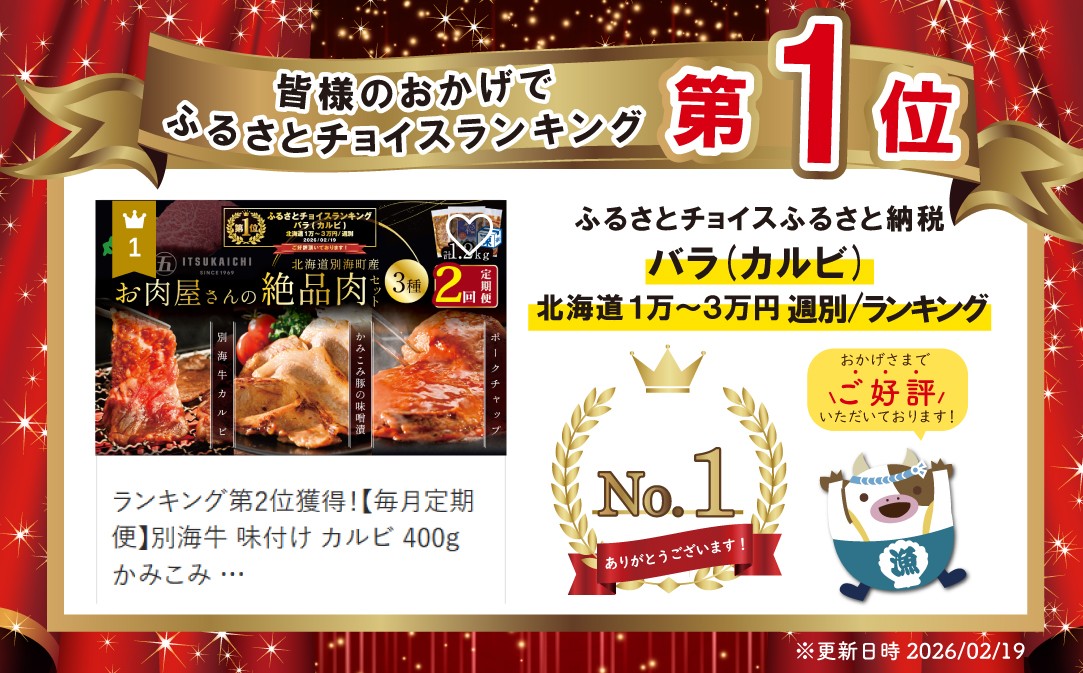 - 【毎月定期便】別海牛 味付け カルビ 400g かみこみ 豚味噌漬け 400g ポークチャップ 400g 計1.2kg セット ×2ヵ月【有限会社五日市】 焼肉 牛肉 豚肉( 肉 にく 豚肉 牛肉 焼肉 セット 北海道 別海町 ふるさとチョイス ふるさと納税 仕組み キャンペーン 限度額 計算 ランキング やり方 シミュレーション チョイス チョイスマイル 肉 牛肉 定期便 )