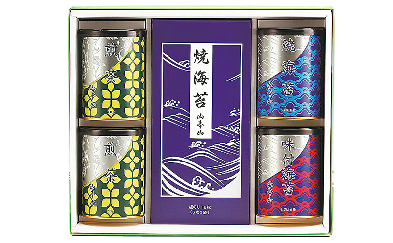 - [№5695-1618]【ギフト包装対応】山本山 海苔・銘茶(焼海苔8切36枚、味付海苔8切36枚、板のり12枚、煎茶70g×2)
