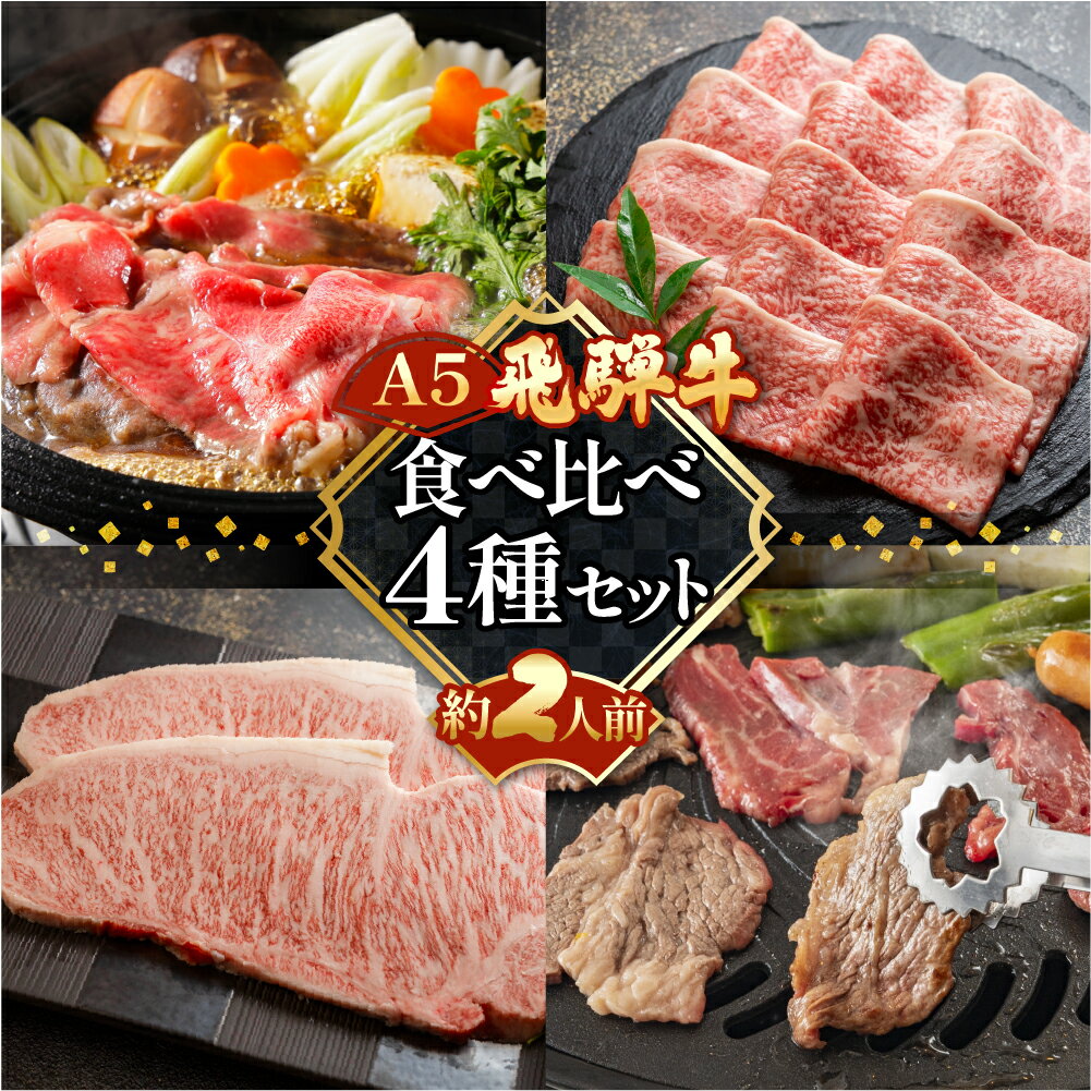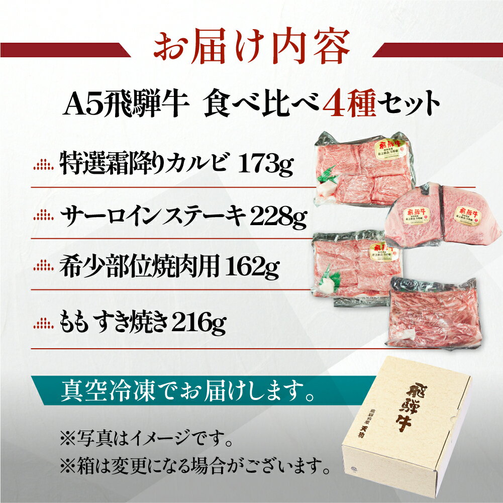 【ふるさと納税】飛騨牛 A5 食べ比べ4種セット(特選霜降りカルビ 173g・サーロインステーキ 228g・希少部位焼肉用 162g・ももすき焼き 216g)【冷凍 真空】牛肉 霜降り しもふり ステーキ もも すき焼き焼肉 牛 天狗 45000円