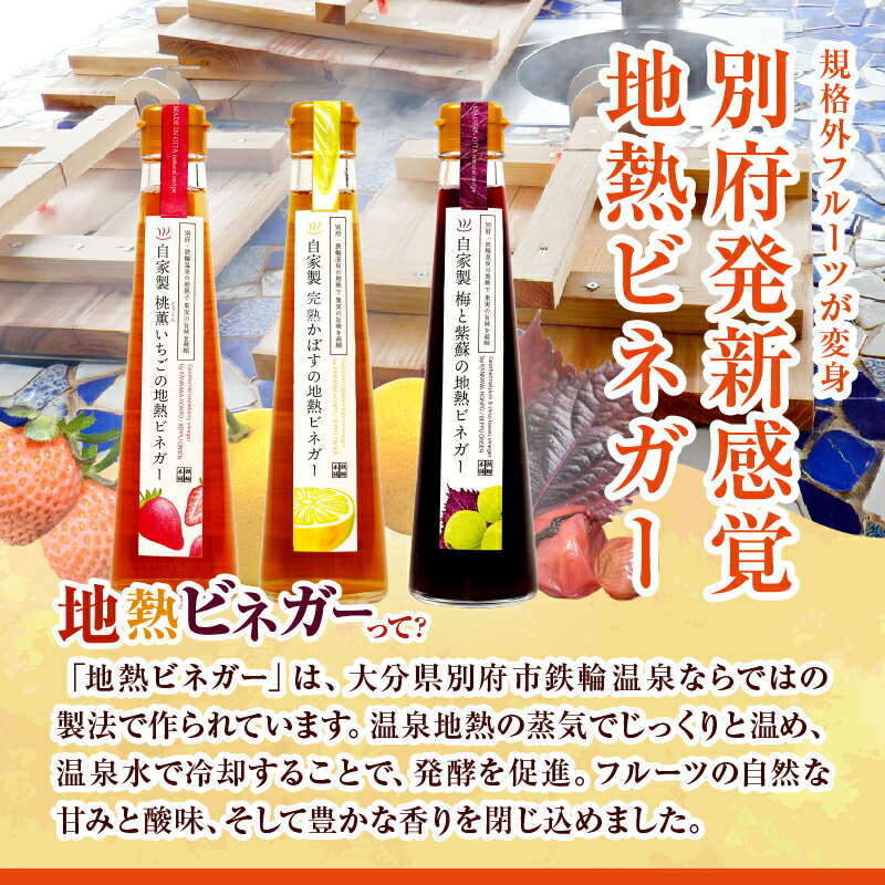 【ふるさと納税】地熱 ビネガー 3種 セット 200ml 3本 酢 フルーツ酢 いちご カボス 梅 紫蘇 酎ハイ ハイボール ビネガービール 甘酒 豆乳 かき氷のシロップ 飲み比べ 贈答品 プレゼント 鉄輪温泉 地獄蒸し お土産 ご当地 別府 大分県 送料無料