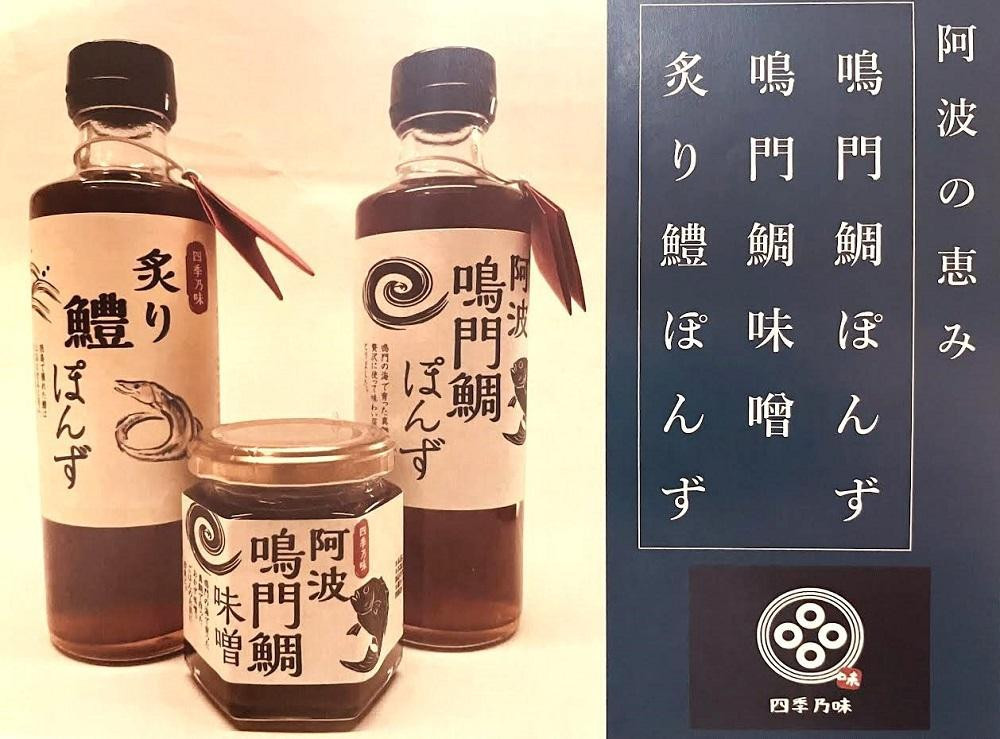 阿波鳴門鯛ぽんず(275ml)・炙り鱧ぽんず(275ml)・鳴門鯛味噌(125g)セット中(各1個)