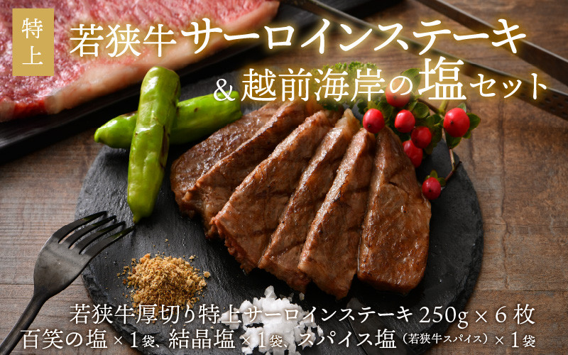 若狭牛 特上サーロインステーキ 250g × 6枚 & 越前海岸の百笑の塩・結晶塩・若狭牛専用スパイス セット [J-1852]