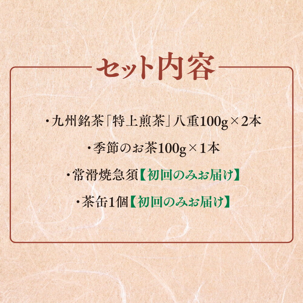 - 【ふるさと納税】【毎月お届け6回】特上煎茶八重2本と季節のお茶1本(合計100g×3本) 【佐賀県産 銘茶 嬉野茶 知覧茶 まろやか コク 香り お徳用 定期便】(H047104)