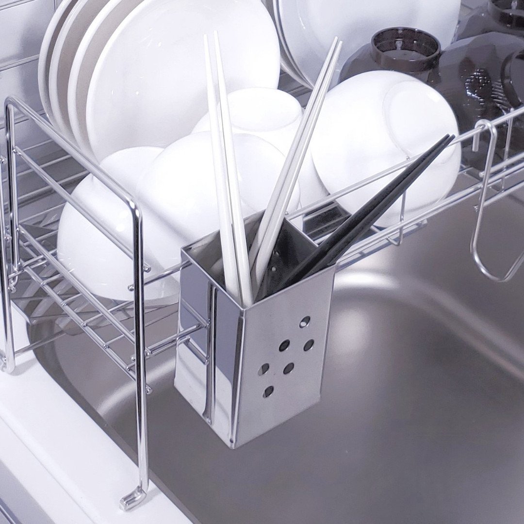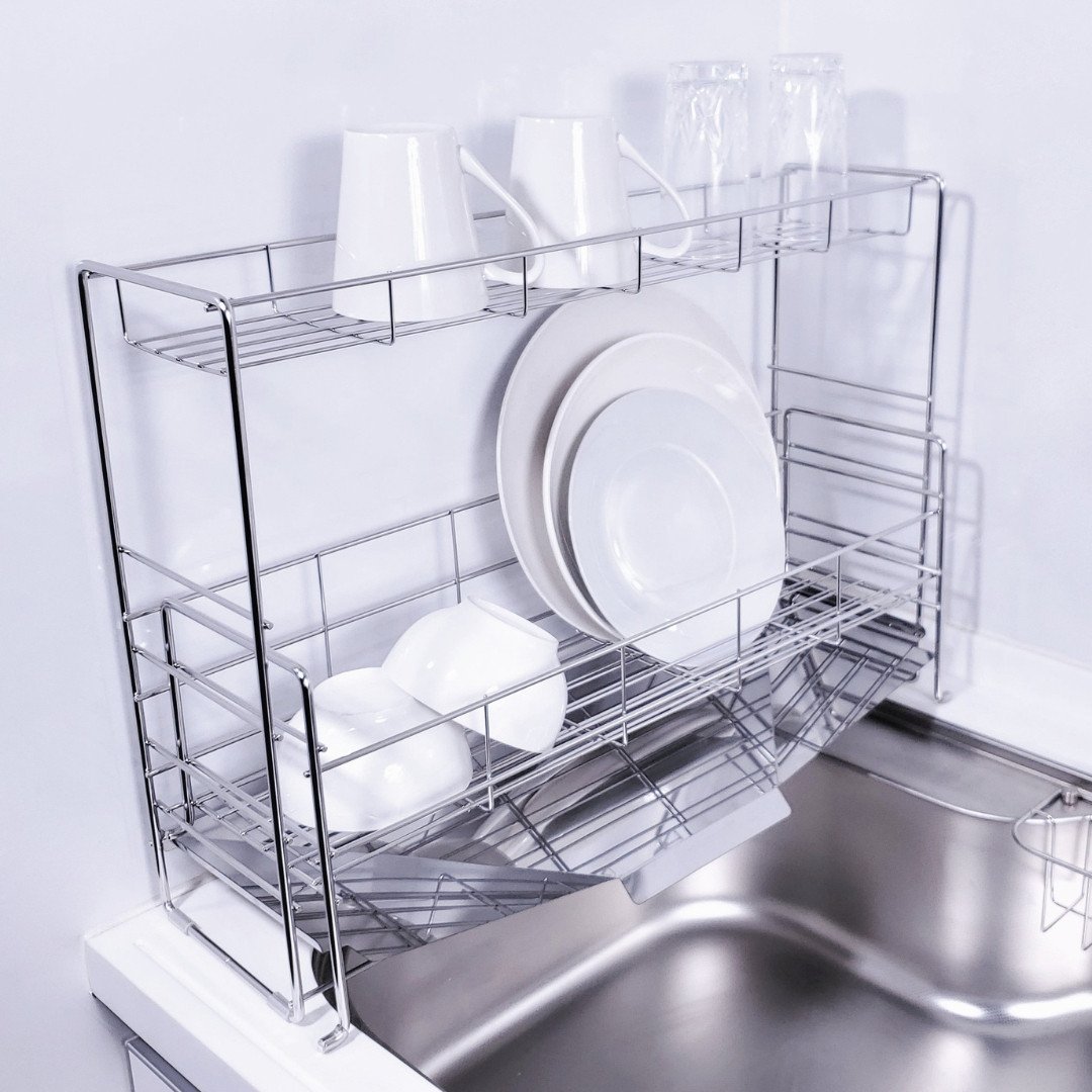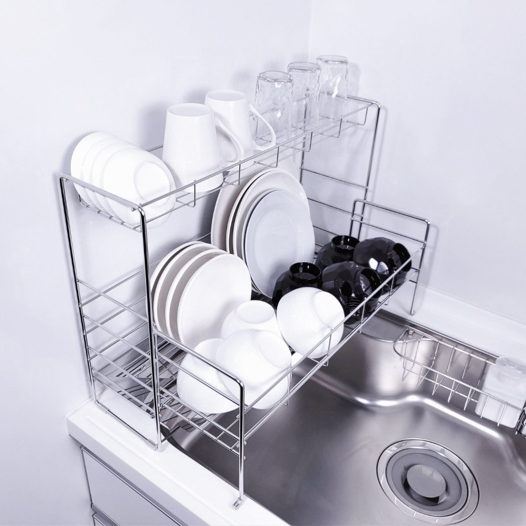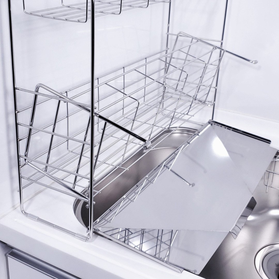 - [燕三条水切り直販店]スライド水切りラック ステンレス 2段タイプ 水切りかご 流れるトレー付き【030S037】