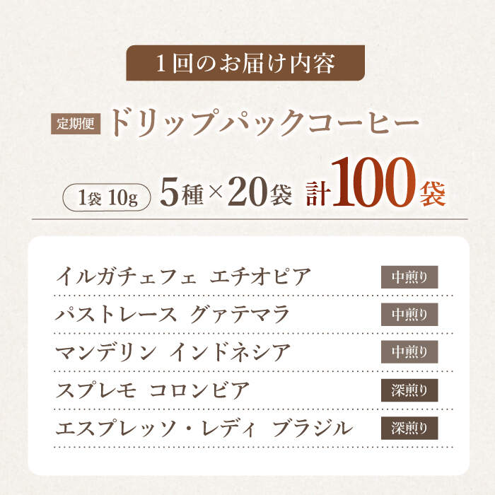 - 【ふるさと納税】【飲み比べ】【12回定期便】ドリップバック 自家焙煎コーヒー 100袋(5種類×20袋) <giko coffee> [CFK040]