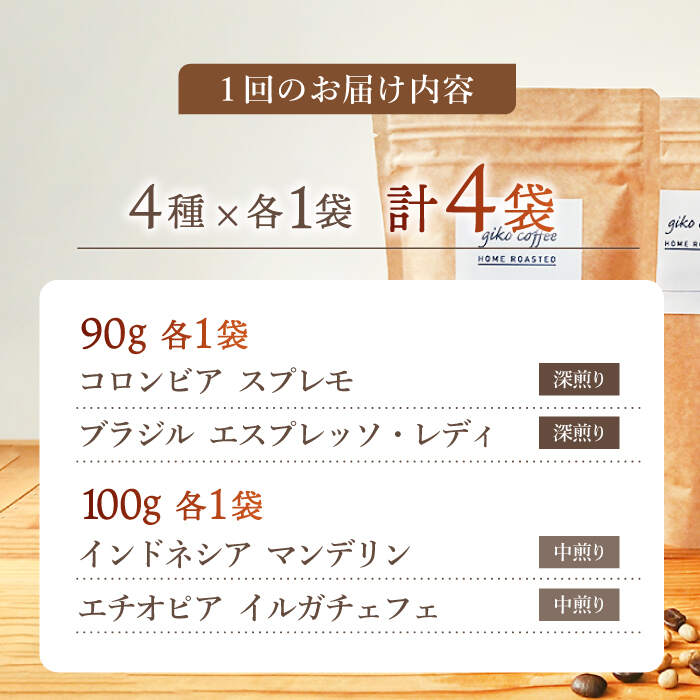 - 【ふるさと納税】【豆タイプ】【6回定期便】【飲み比べセット】自家焙煎コーヒー 4種類 各1袋<giko coffee> [CFK044]