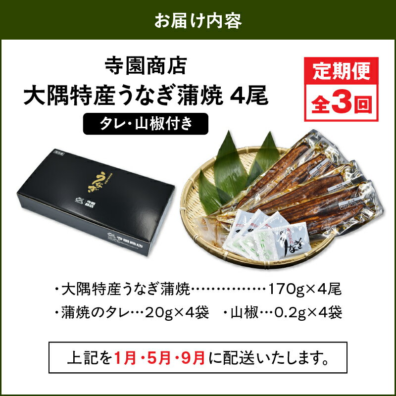【ふるさと納税】【定期便3回】大隅特産うなぎ蒲焼4尾(680g)×3回 合計12尾 計2.04kg 【国産】たれ付 真空パック 湯煎 レンジ 簡単調理 国産 国産うなぎ 定期 うなぎ蒲焼 小分け 定期便 鹿児島県 鹿屋市【寺園商店】