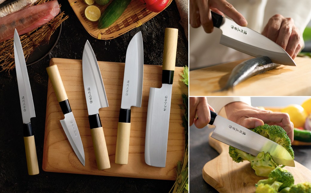 - 濃州正宗作 和包丁セット(包丁5本セット)【三徳包丁、菜切包丁、出刃包丁、刺身包丁、ペティナイフ】~和包丁 ステンレス素材なので錆びづらい 関の職人 白木ハンドル ほうちょう 包丁 日本製 国産 新生活セット ステンレス おすすめ 人気 初心者の方にも~