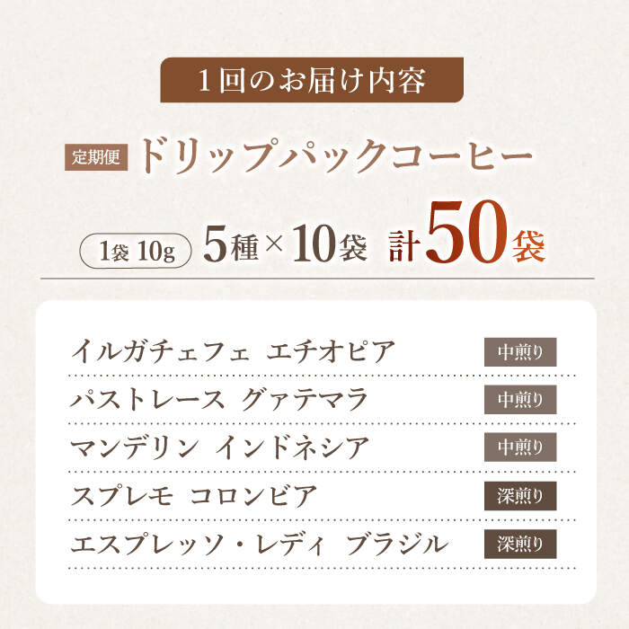 - 【ふるさと納税】【飲み比べ】【12回定期便】ドリップバック 自家焙煎コーヒー 50袋(5種類×10袋) <giko coffee> [CFK037]