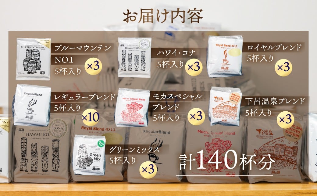 - 自家焙煎珈琲大容量ドリップコーヒーアソート 7種 計140杯分 コーヒー 珈琲 ドリップ 下呂温泉 緑の館