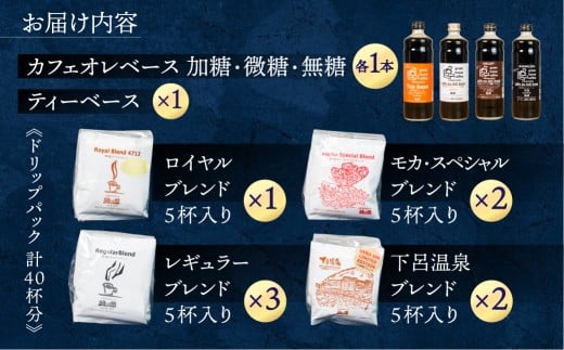 カフェオレベース 3種とティーベース&ドリップコーヒーアソート 40杯分(ロイヤルブレンド、レギュラーブレンド5杯×3、下呂温泉ブレンド5杯×2、モカ・スペシャルブレンド5杯×2 )コーヒー 珈琲 ドリップ 下呂温泉 緑の館 大容量