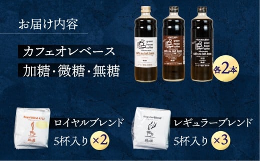 カフェオレベース(加糖・無糖・微糖)各2本&ドリップコーヒーセット(レギュラーブレンド5杯×3、ロイヤルブレンド5杯×2)
