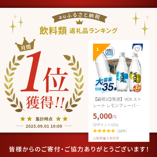 - 【最短3日発送】VOX ストレート レモンフレーバー バナジウム 強炭酸水 500ml 35本 【富士吉田市限定カートン】