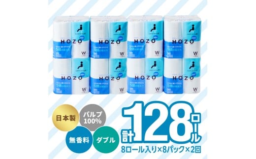 - 【隔月配送】トイレットペーパーHOZO(8ロール×8パック)2回お届け定期便 トイレットペーパー 日本製 無香料 ダブル 吸水力 消耗品 日用品雑貨 大容量 まとめ買い 定期便 T10041