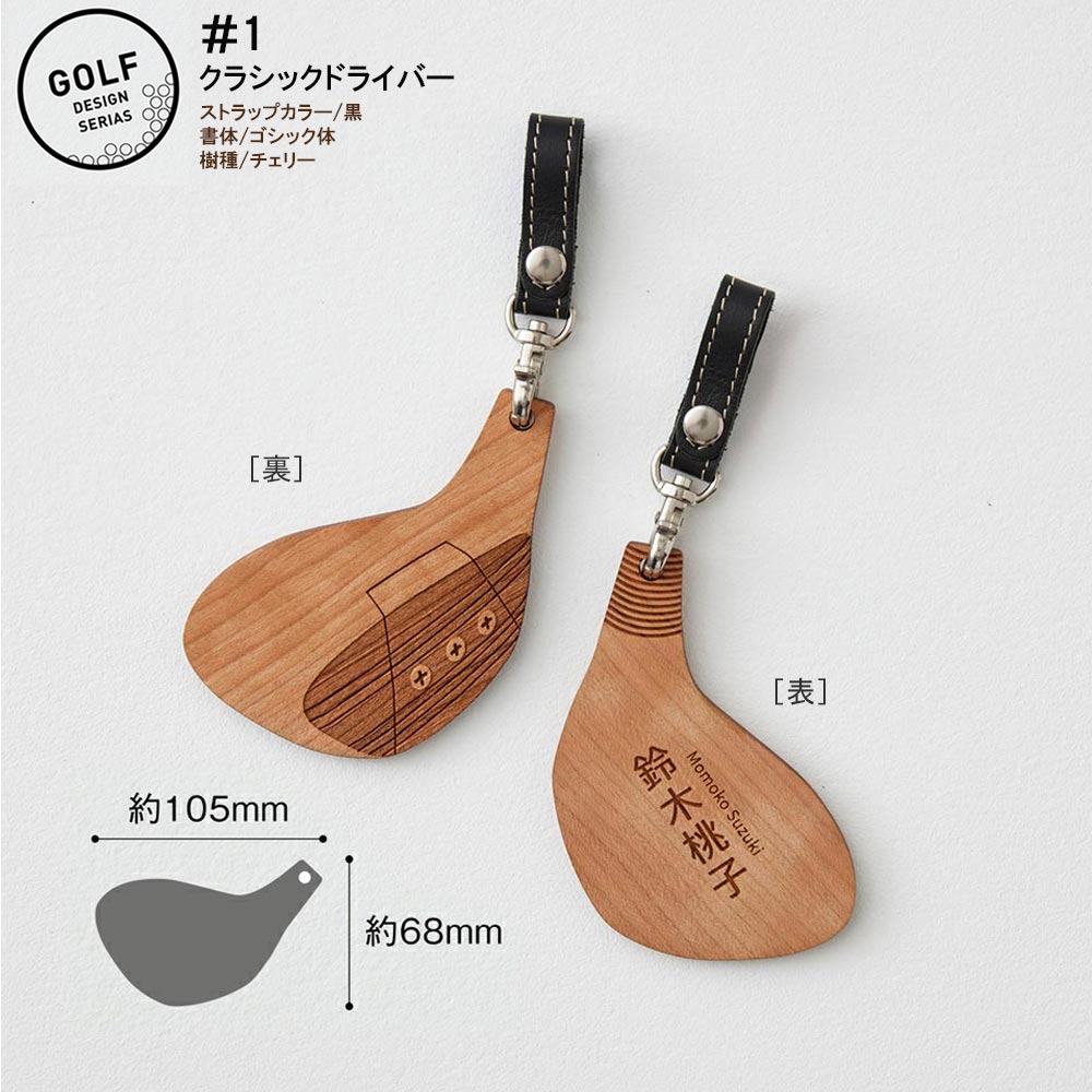 - ゴルフ ネームプレート 木製 両面デザイン 本革ストラップベルト 刻印 名入れ (#1:クラシックドライバー)【四国加工】