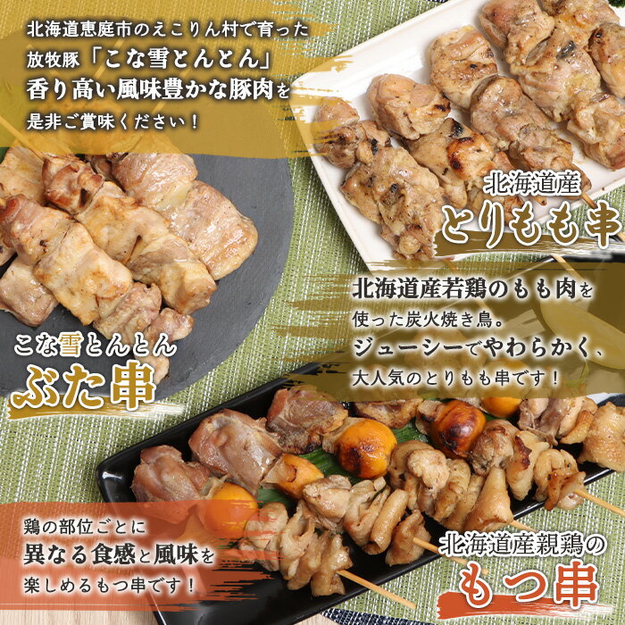- 【ふるさと納税】こな雪とんとん ぶた串 北海道産 親鶏 もつ串 とりもも串 各5本 計15本 オンライン 申請 ふるさと納税 北海道 恵庭 豚串 放牧豚 モツ串 焼鳥 鳥もも 炭火焼き 惣菜 おかず おつまみ 簡単調理 時短 冷凍 恵庭市【810015】