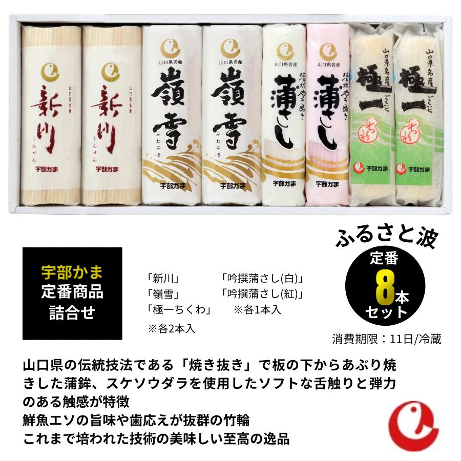 【ふるさと納税】 ふるさと波 (新川×2本、嶺雪×2本、吟撰蒲さし(紅)×1本、吟撰蒲さし(白)×1本、極一ちくわ×2本) 【天然 麦わら 手巻き 蒸し かまぼこ 伝統製法 焼き 抜き 蒲鉾 ちくわ エソ 旨味 歯応え 竹輪 スケソウダラ 正月 おつまみ 食べ応え プレゼント ギフト 】