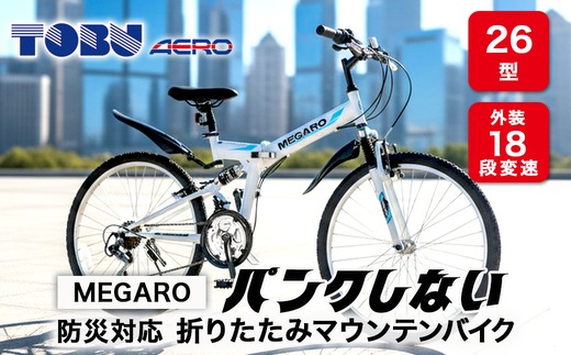MEGARO 防災対応26型18スピードノンパンク折りたたみマウンテンバイク 色:ホワイト※ 沖縄・離島への発送はできません・ご了承ください。
