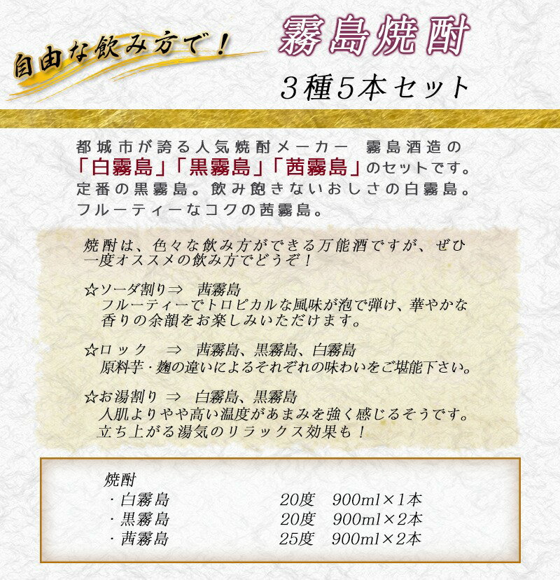 - 【ふるさと納税】自由な飲み方で!霧島焼酎3種5本セット≪みやこんじょ特急便≫ - 芋焼酎 白霧島20度×1本 黒霧島20度×2本 茜霧島25度×2本 3種類飲み比べセット 全て五合瓶 黄金千貫 タマアカネ使用 送料無料 17-2103【宮崎県都城市は2年連続ふるさと納税日本一!】
