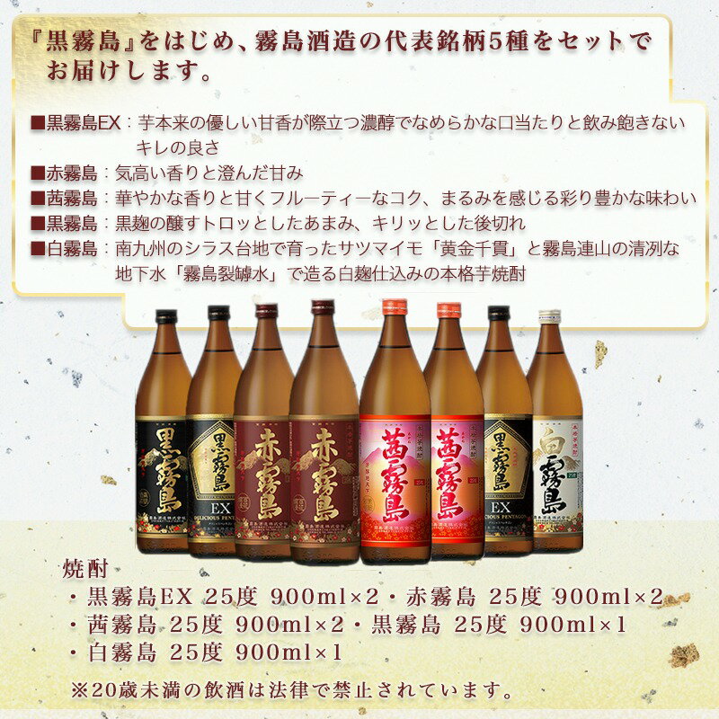 - 【ふるさと納税】優雅なひととき霧島25度8本セット≪みやこんじょ特急便≫ - 黒霧島EX/赤霧島/茜霧島(各900ml×2本) 黒霧島/白霧島(各900ml×1本) 計8本 いも焼酎 アルコール 霧島酒造 飲み比べ 五合瓶 送料無料 27-8203【宮崎県都城市は2年連続ふるさと納税日本一!】