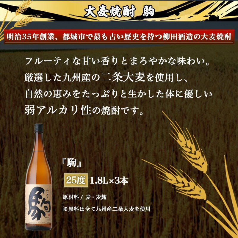 【ふるさと納税】【柳田酒造】大麦焼酎 駒(25度)1.8L×3本 ≪みやこんじょ特急便≫ - 大麦焼酎 25度 1.8L×3本セット 瓶 定番焼酎 むぎ焼酎 定番焼酎 送料無料 AD-0751_99【宮崎県都城市は2年連続ふるさと納税日本一!】