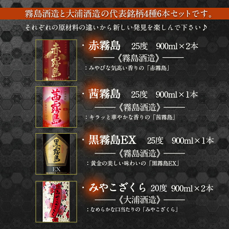 【ふるさと納税】霧島「赤・茜・黒EX」と「みやこざくら」900ml×6本セット≪みやこんじょ特急便≫ - 赤霧島 25度(900ml×2) 茜霧島 25度(900ml×1) 黒霧島EX 25度(900ml×1) みやこざくら 20度(900ml×2) 送料無料 AC-8101【宮崎県都城市は2年連続ふるさと納税日本一!】