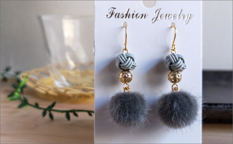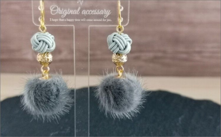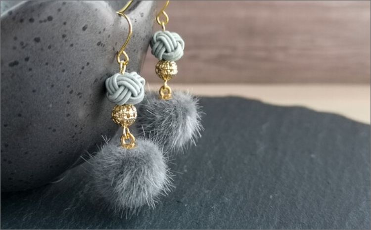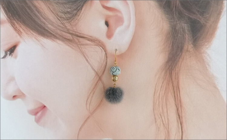 - *薄墨色(グレー)*水引ピアス/玉結びとフェイクファーのピアス AM00322