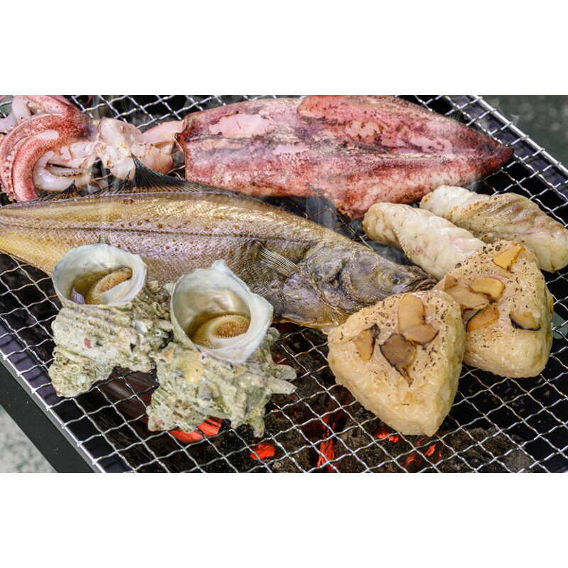 【ふるさと納税】BBQに最適! 誰でも簡単に焼ける サザエ&白イカ&干物セットに、 サザエご飯のおにぎり付き 2人用 ※万能ダシ付き 魚介類 セット 詰め合わせ サザエ イカ 干物 おにぎり サザエおにぎり BBQ 魚屋 焼きおにぎり さざえおにぎり