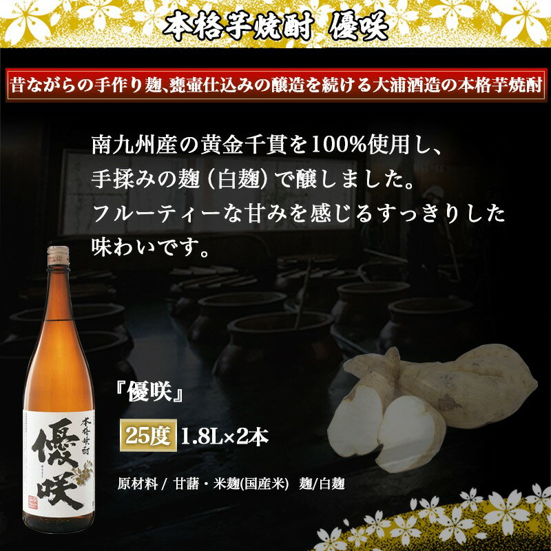 - 【ふるさと納税】【大浦酒造】優咲(25度)1.8L×2本 ≪みやこんじょ特急便≫ - 大浦酒造 一升瓶 2本セット 25度 甕壷仕込み 手作り麹 本格芋焼酎 定番焼酎 送料無料 MJ-0773_99【宮崎県都城市は2年連続ふるさと納税日本一!】